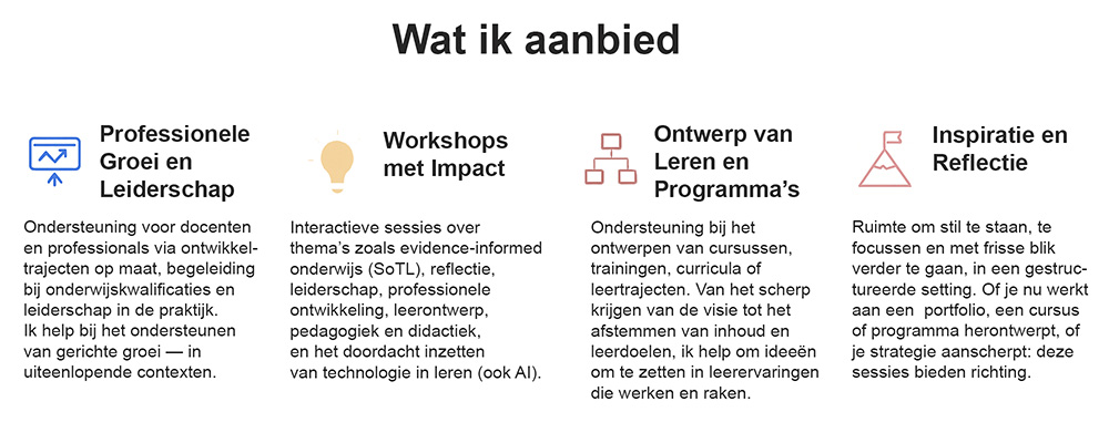 Of je nu werkt in het onderwijs, professionele ontwikkeling of een organisatie die leerprogramma’s aanbiedt, ik help om ideeën te vertalen naar leerervaringen die echt blijven hangen.